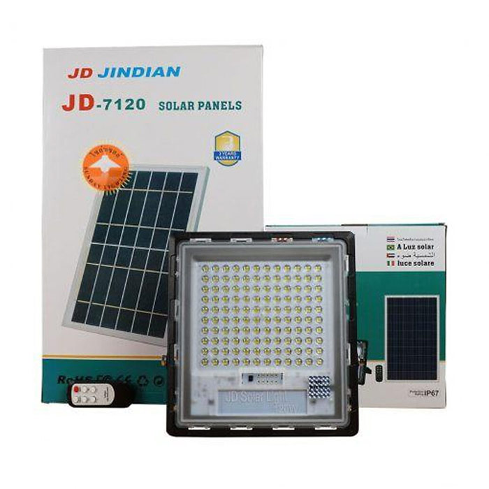 Đèn pha led năng lượng mặt trời chống chói 120W của Jindian JD-7120 là sản phẩm công nghệ mới tích hợp khả năng chống chói giúp giảm ảnh hưởng lên mắt. Tích hợp 120 bóng LED chóng chói cao cấp 3030 SMD với tuổi thọ cao và khả năng chiếu sáng hoàn hảo, bộ đèn có dung lượng pin lưu trữ lớn có thể chiếu sáng liên tục trong 12h với thời gian xạc chủ từ 4-6h, sản phẩm có tuổi thọ lên tới 15 năm.